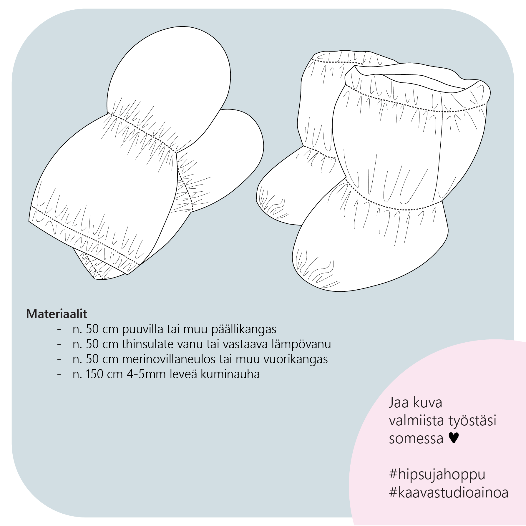 This pattern includes a pattern sheet and Finnish pictorial instructions for making baby outdoor mittens and slippers.To make Hipsu mittens you will need: