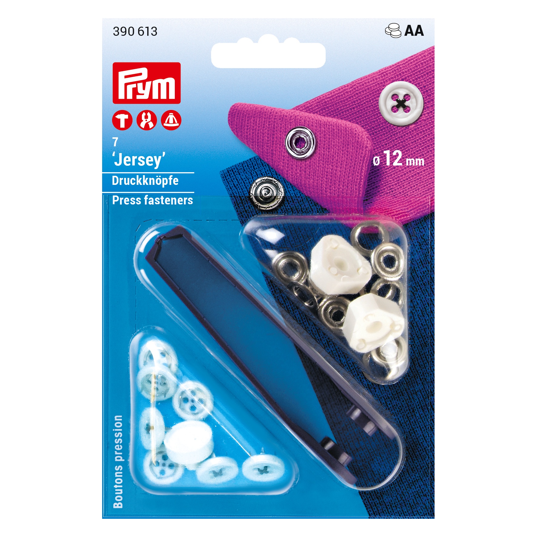 To attach the 12 mm diameter snaps, you can use: the included tool, VARIO pliers, or Prym tripod tool.