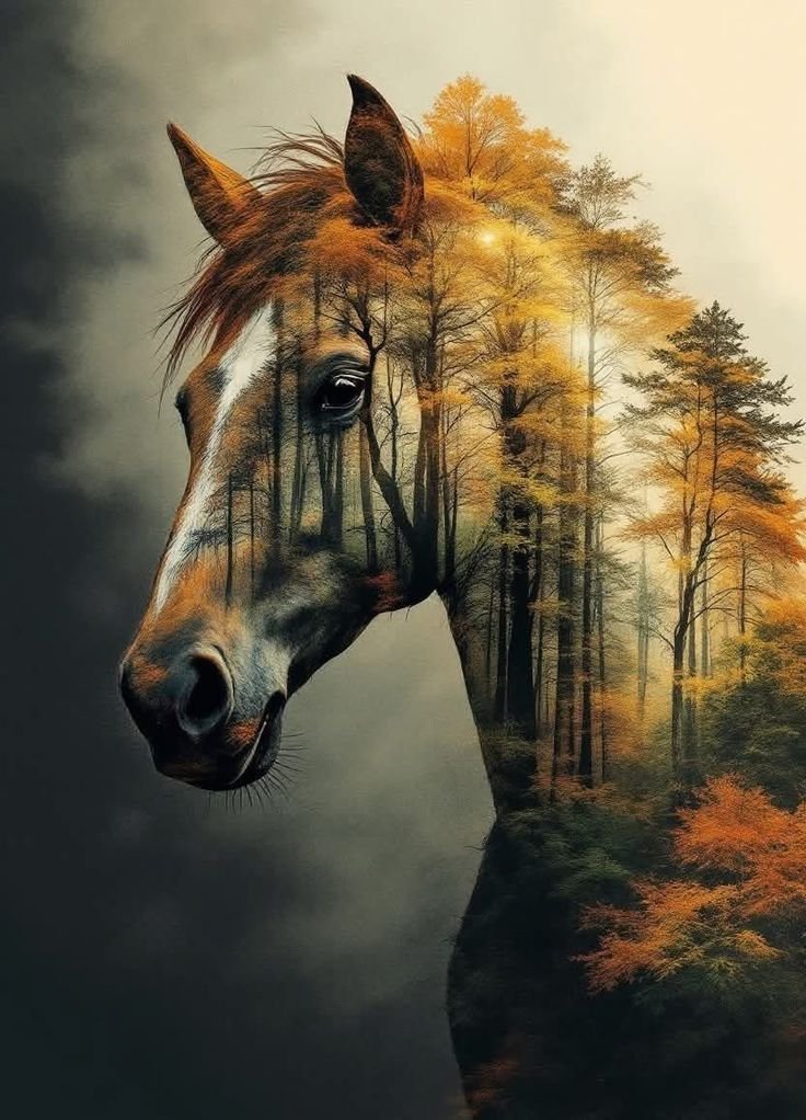 Hobuse ja sügisese metsa kunstiline sulandus