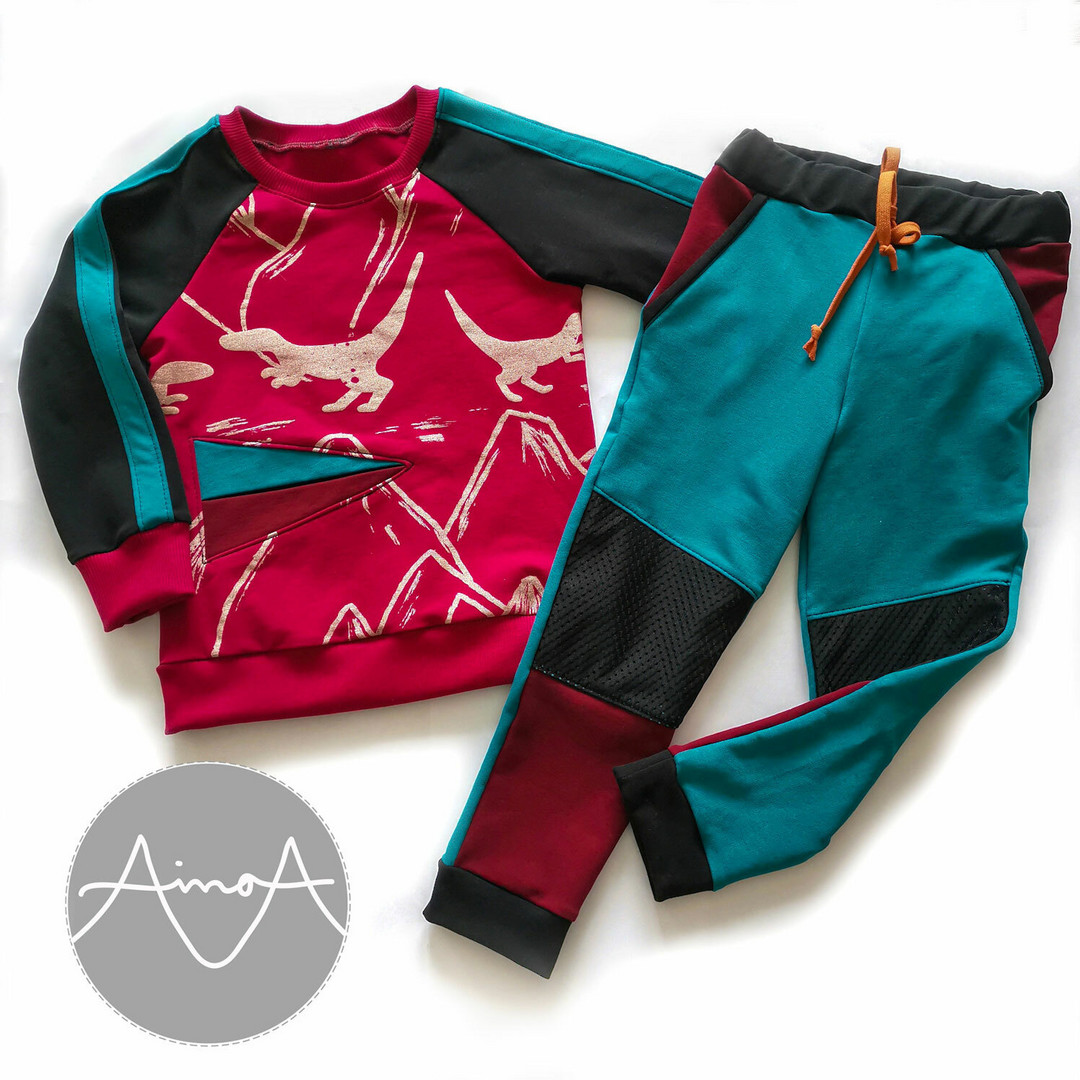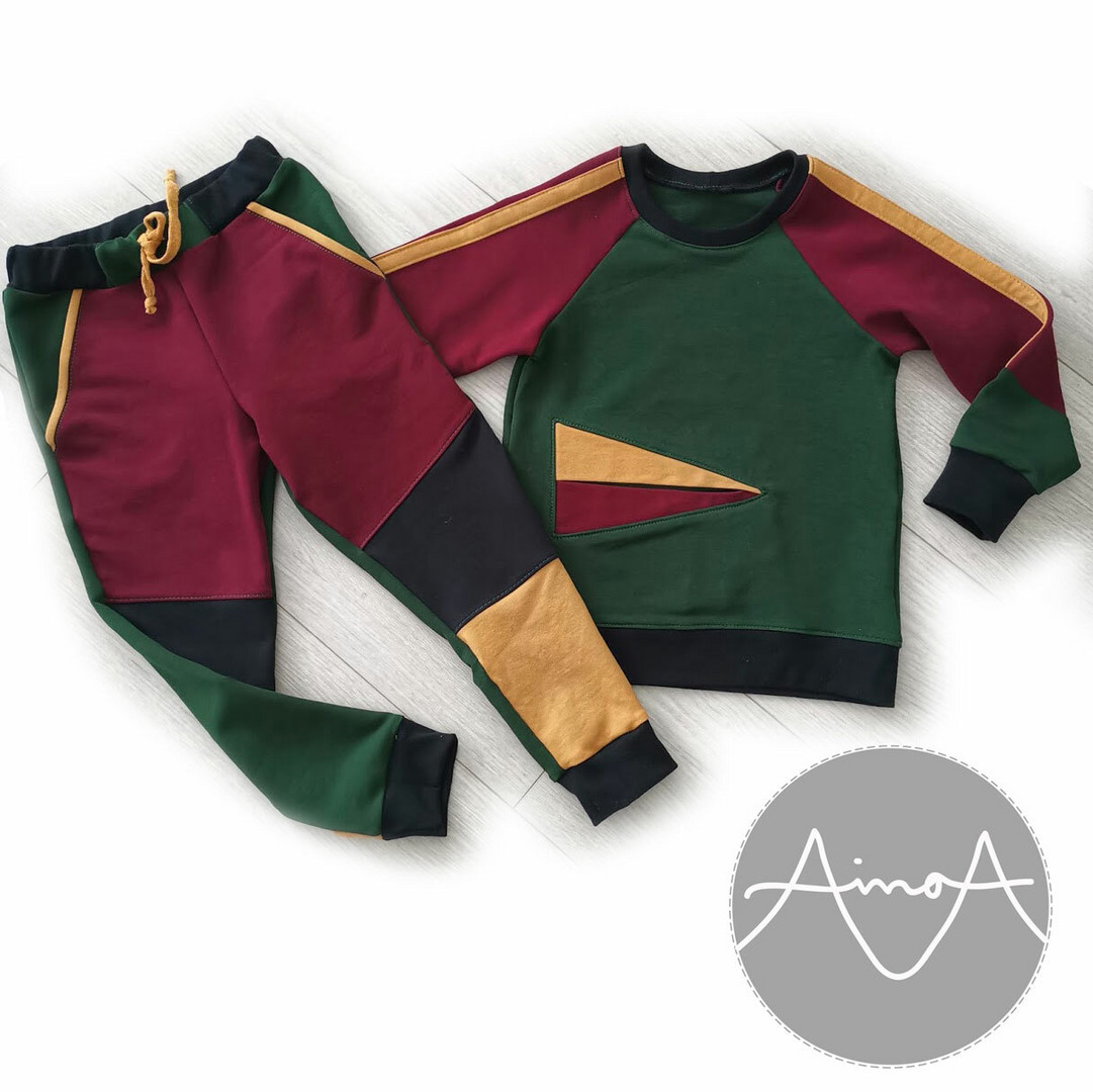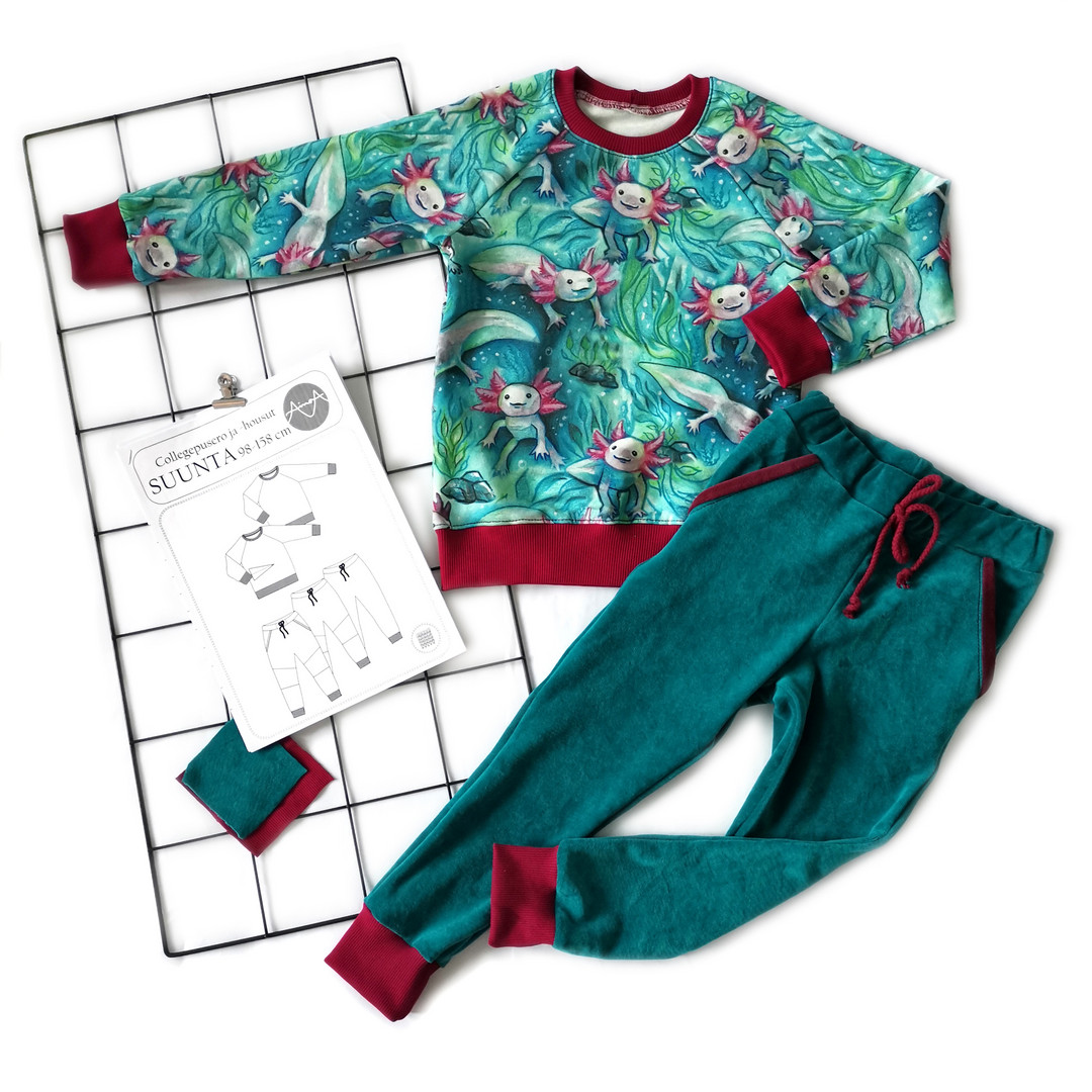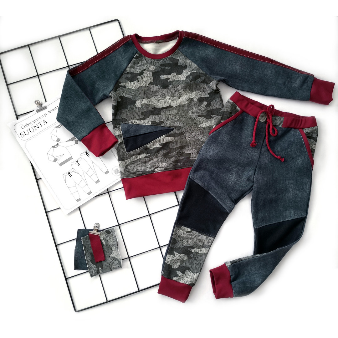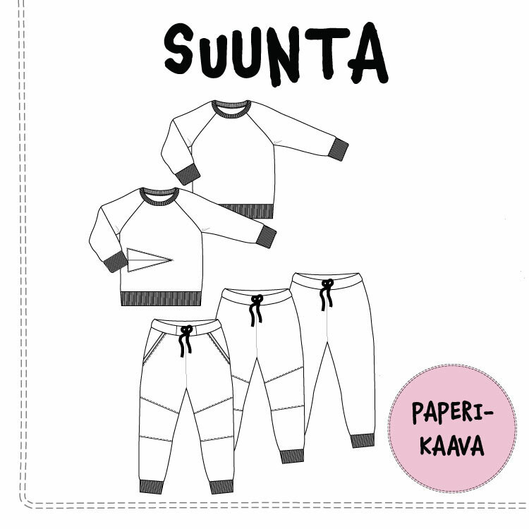 See lõige sisaldab lõikelehti ja soomekeelseid pildilisi juhendeid stiilse Suunta dressikomplekti valmistamiseks.