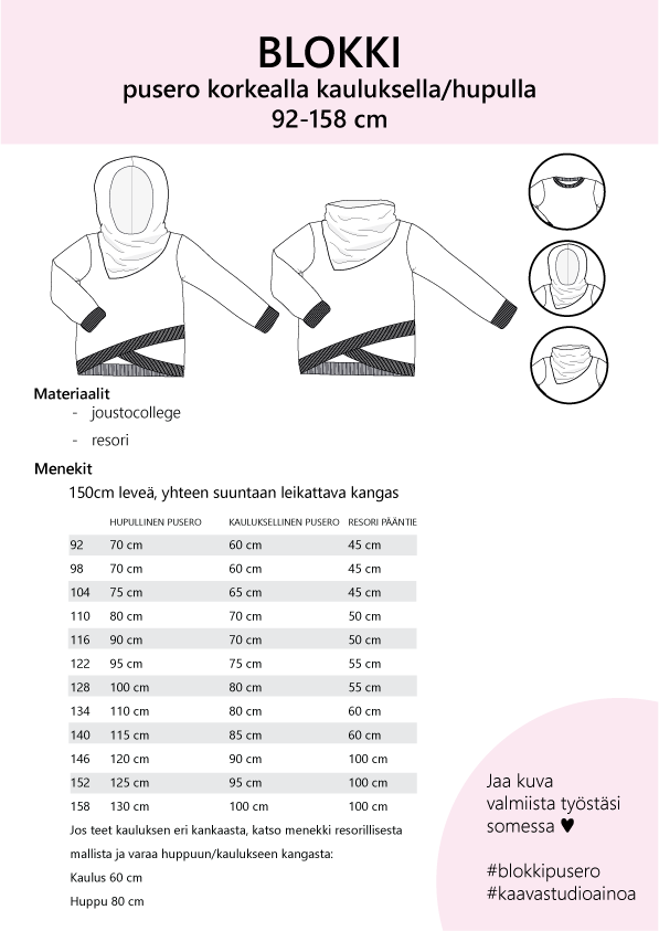 See dressipluusi õmblemise lõige sisaldab lõikelehti ja soomekeelseid pildiliste juhistega õpetusi Blokki-pusa valmistamiseks.