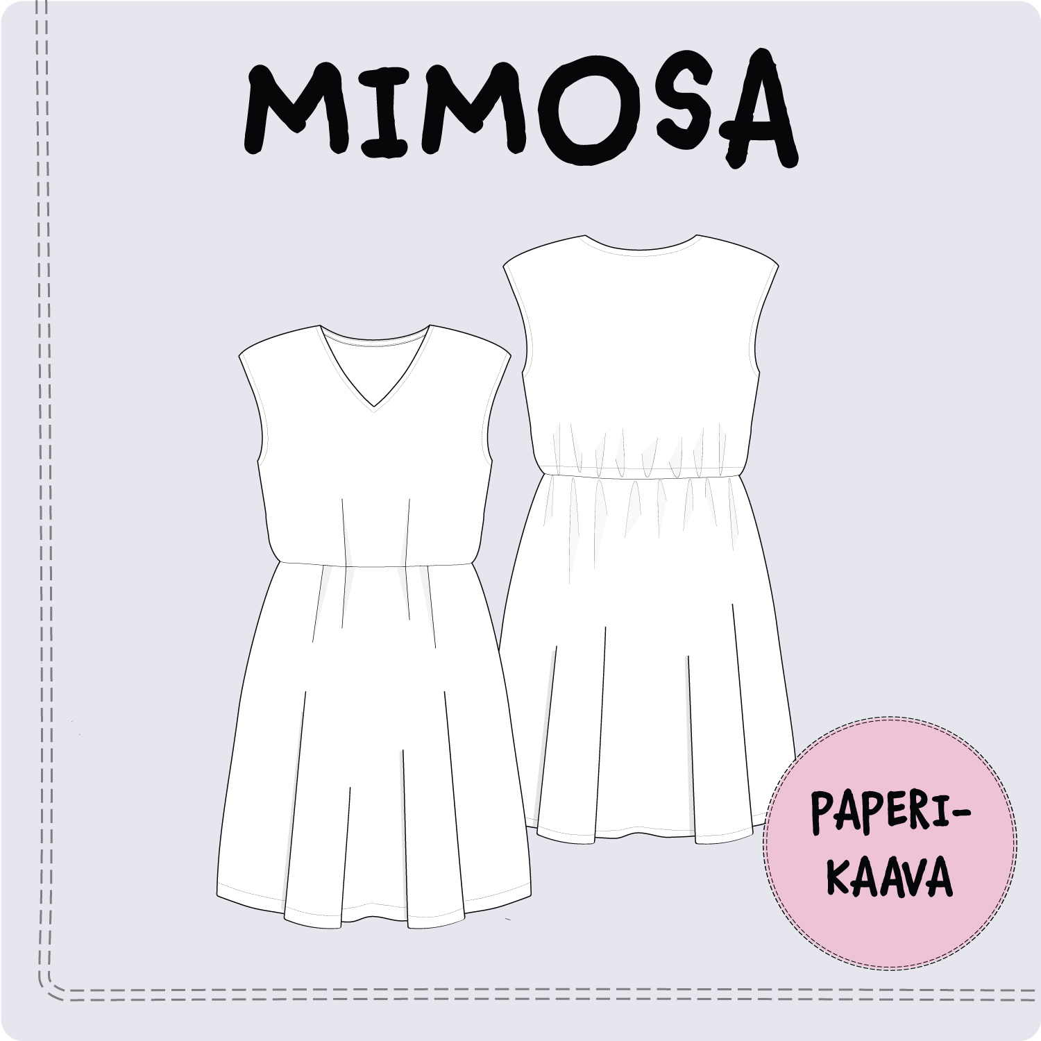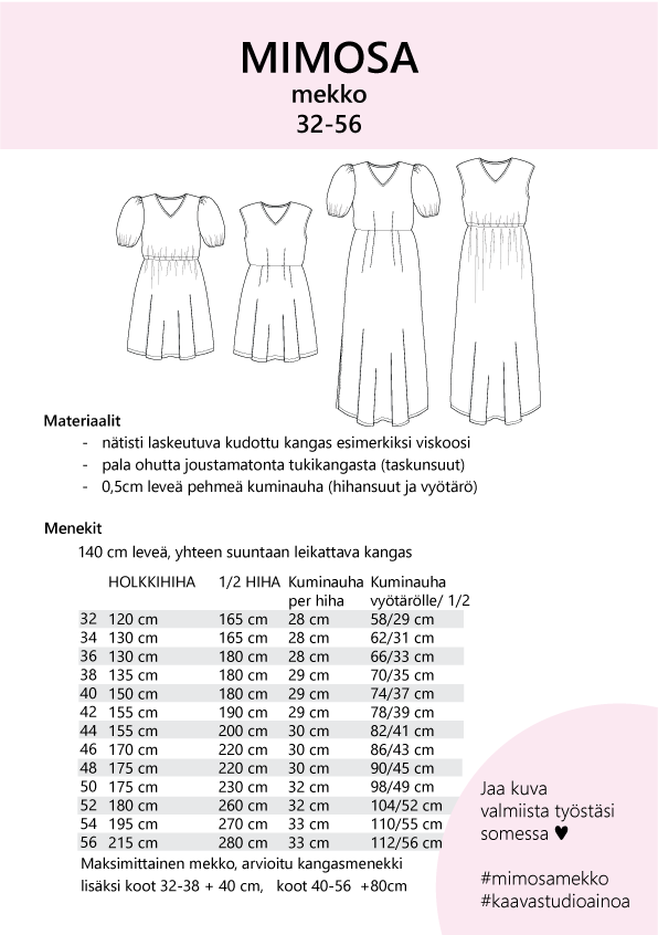 See õmblemislõige sisaldab lõikelehti ja soomekeelseid pildilisi juhiseid kauni ja mitmekülgse MIMOSA-kleidi õmblemiseks. Kleit valmistatakse hästi langevast kootud kangast, näiteks viskoosist või lina segukangast.
