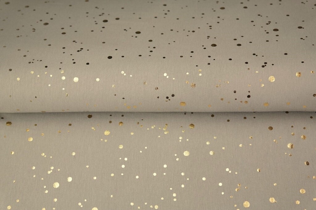 Fooliumtrükiga trikotaaž on pehme ja elastne kangas, mida kaunistavad pilkupüüdvad kuldsed täpid. See sobib suurepäraselt pluuside, kleitide, retuuside ja aksessuaaride valmistamiseks, lisades rõivastele pidulikkust ja särtsu.