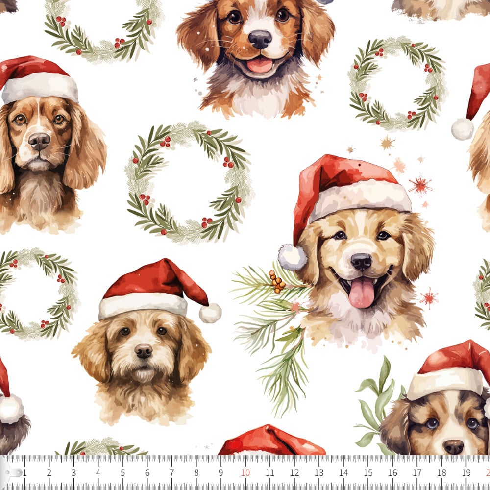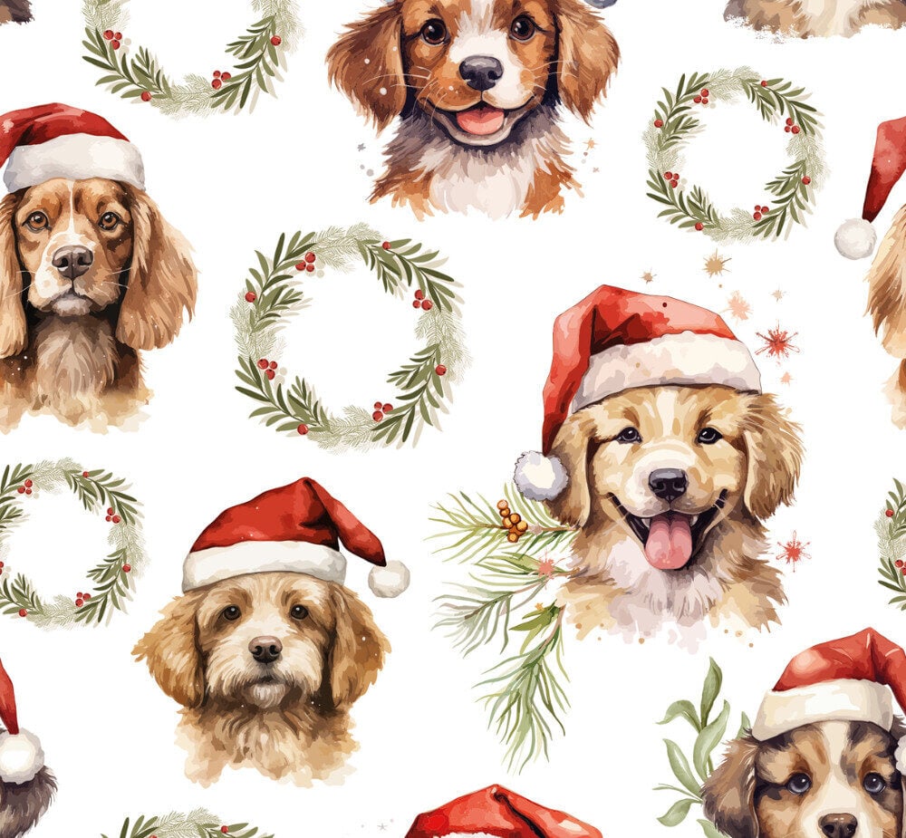 Jõulukoerad punaste mütsidega ja pärjad taustal