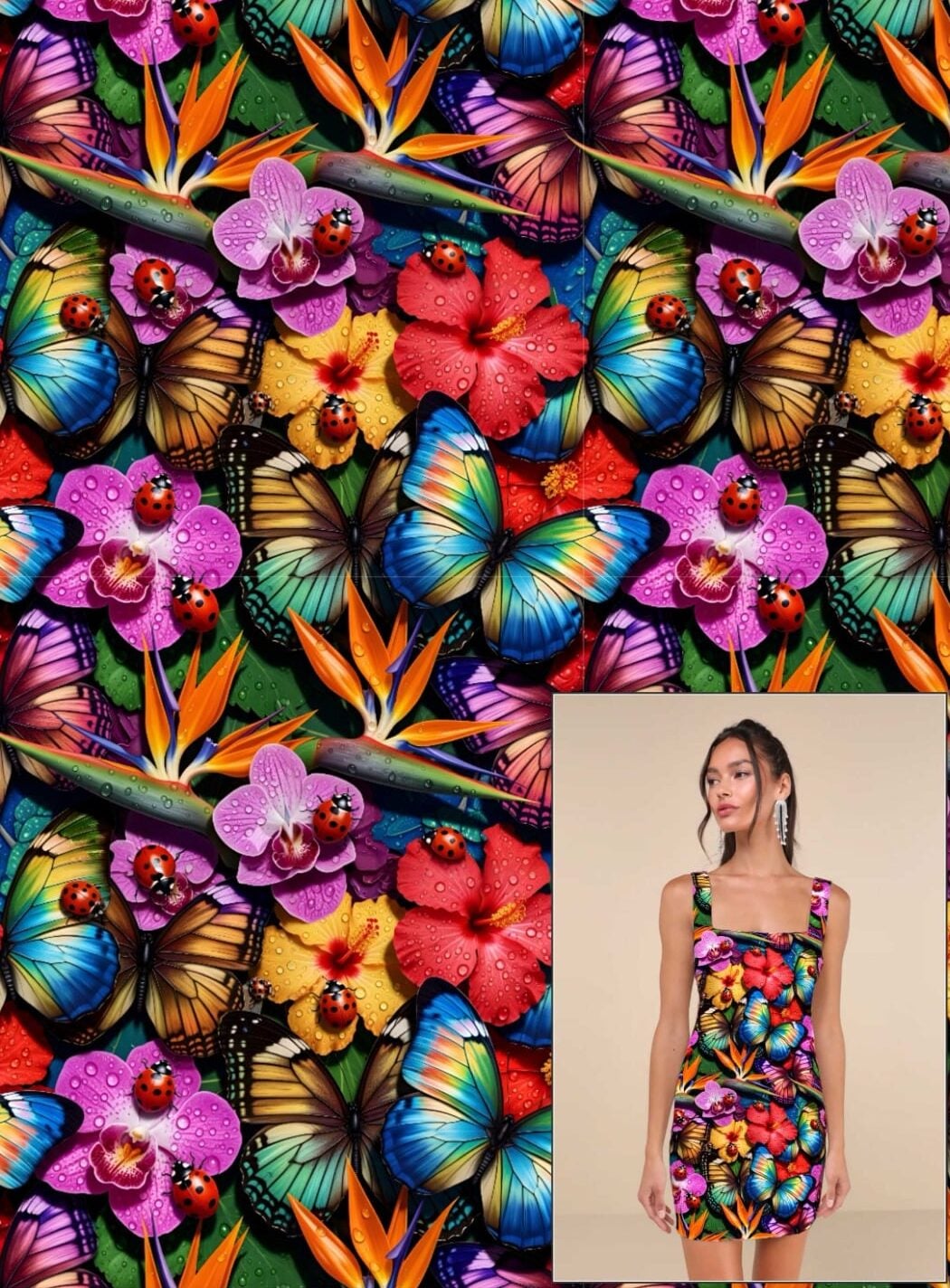 Värvikas liblikate ja lillede muster kangadisainil