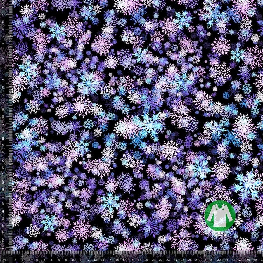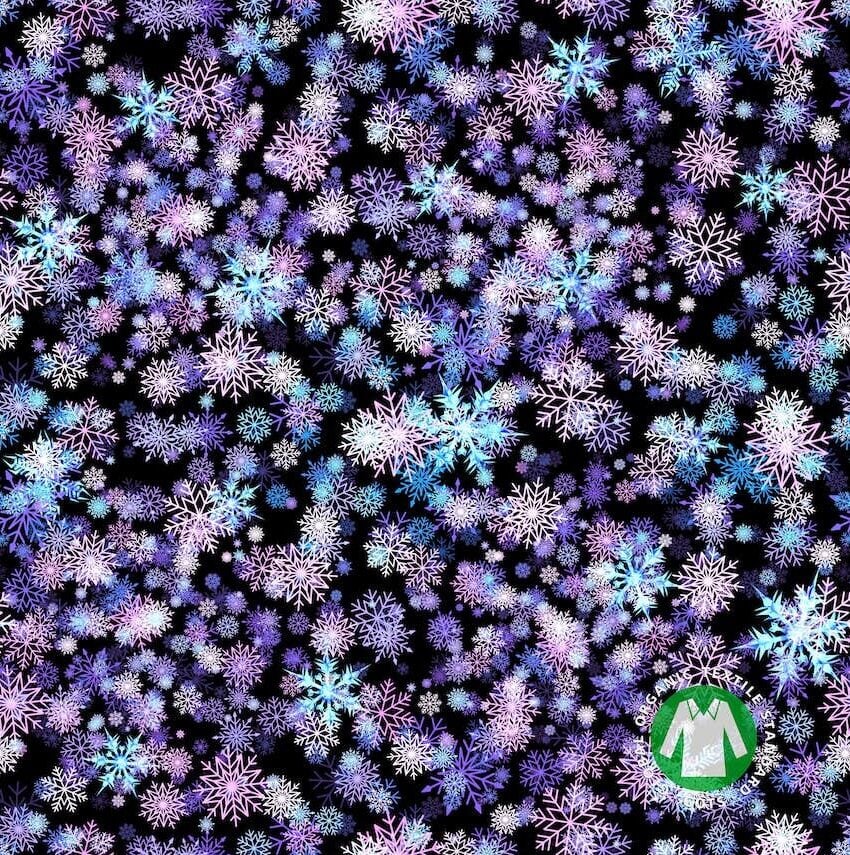 Trikotaaž lillad ja kuldsed lumehelbed mustal GOTS digital print