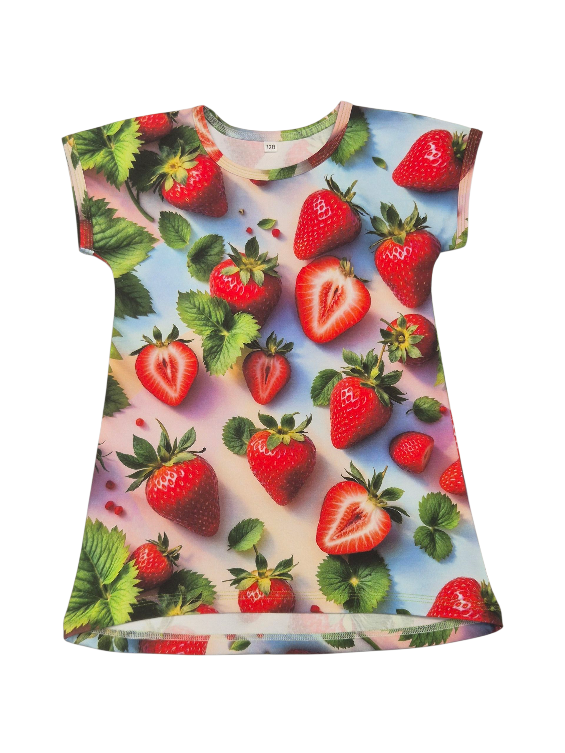 Tüdruk maasikamustriga kleidis kollase taustaga