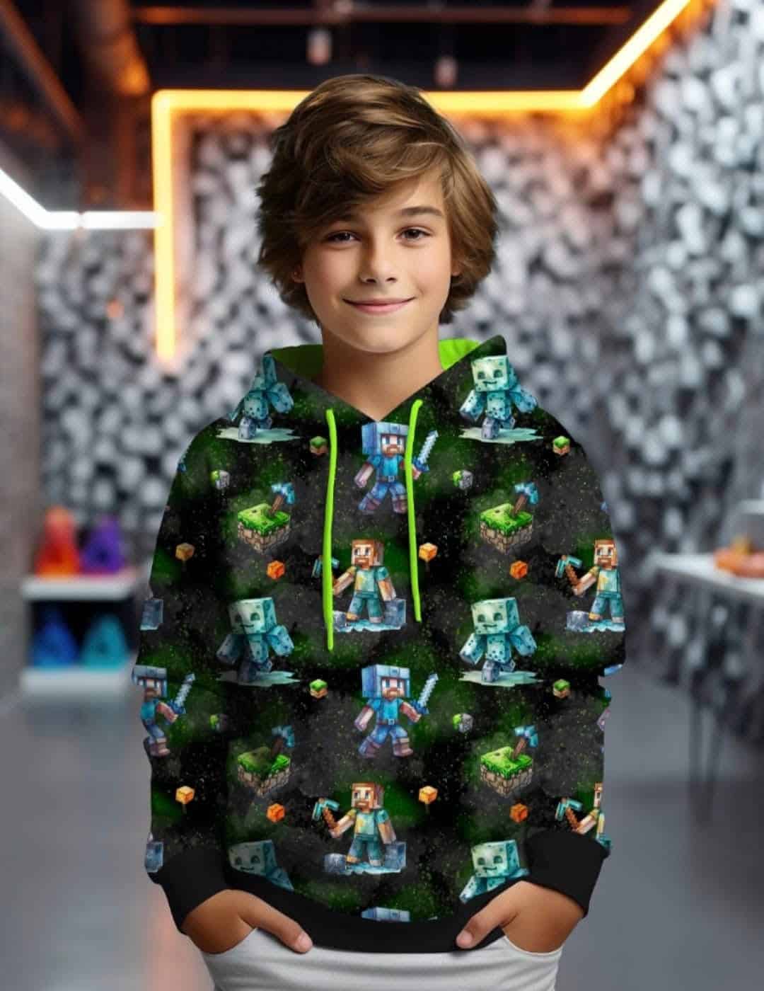 Poiss kannab Minecrafti mustriga kapuutsiga pusat