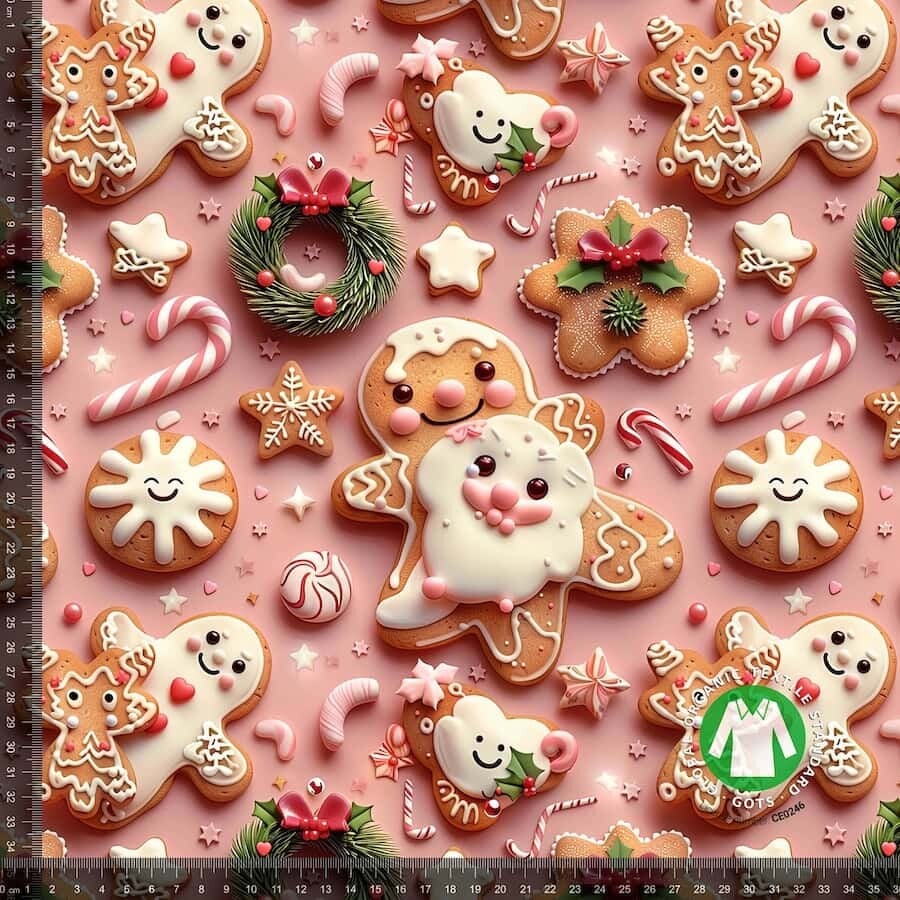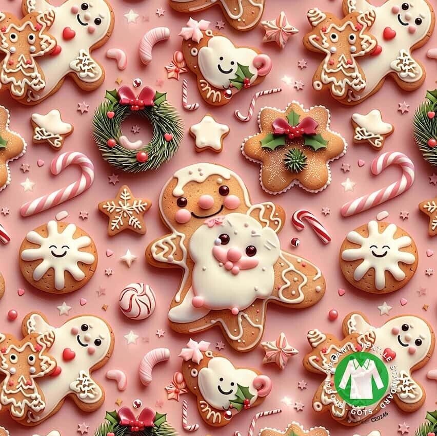 Jõuluteemalised piparkoogid ja kommid roosal taustal