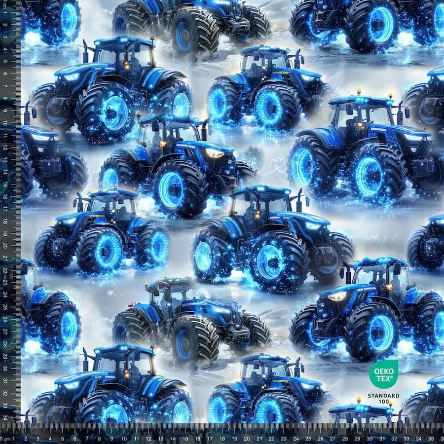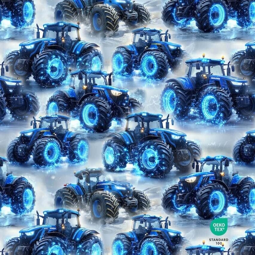 Sinised traktorid helendavate ratastega mustrilisel taustal