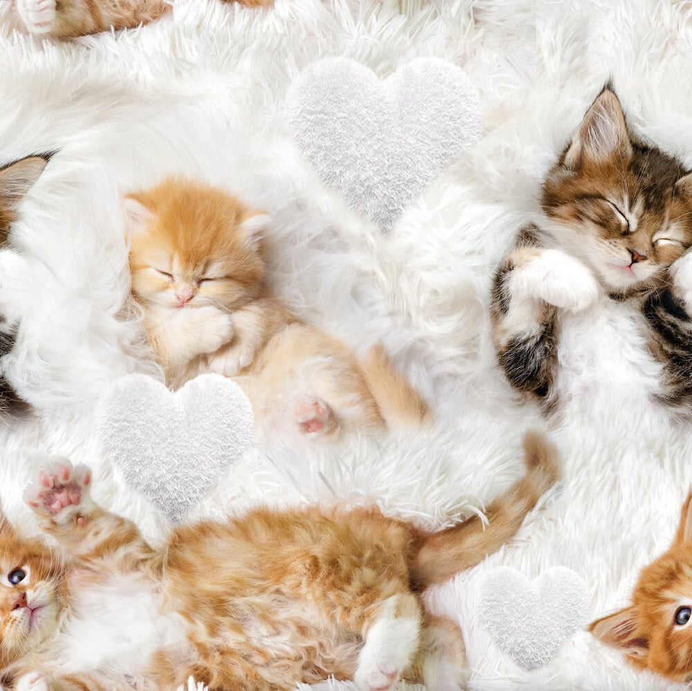 Armsad kassipojad magavad pehmel valgel karvastikul