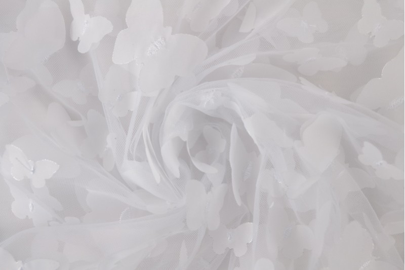 3D tüll on efektne ja eriline kangas, millel on tüllipinnale lisatud ruumilised kaunistused – olgu need siis lillemotiivid, volangid või muud dekoratiivsed elemendid. Tänu kolmemõõtmelisele struktuurile on kangal ainulaadne ja luksuslik välimus, mis püüab pilke ja lisab igale esemele erilise ilme.