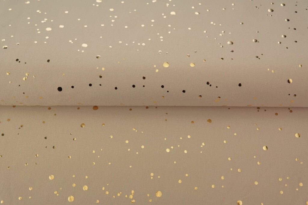 foliopainatuksella trikoo on pehmeä ja joustava kangas, jota koristavat näyttävät kultaiset täplät. Se sopii erittäin hyvin puseroiden, mekkojen, leggingsien ja asusteiden valmistukseen, lisäten vaatteille juhlallisuutta ja säihkettä.