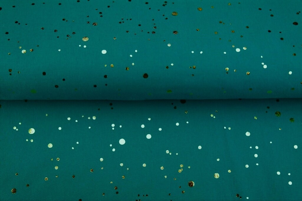 Foliopainettu trikoo on pehmeä ja joustava kangas, jota koristavat näyttävät kultaiset pisteet. Se sopii erinomaisesti paitojen, mekkojen, leggingsien ja asusteiden valmistukseen, lisäten vaatteisiin juhlallisuutta ja säpinää.