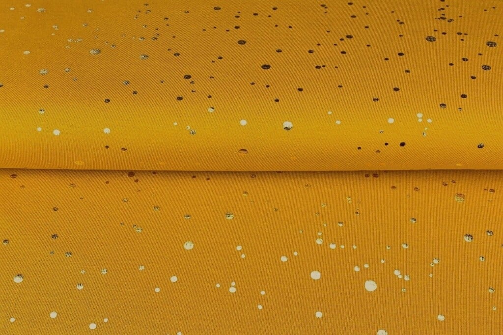 Foliopainatuksella trikoo on pehmeä ja joustava kangas, jota koristavat näyttävät kultaiset pisteet. Se sopii erinomaisesti puseroiden, mekkojen, leggingsien ja asusteiden valmistamiseen, lisäten asuihin juhlallisuutta ja eloisuutta.