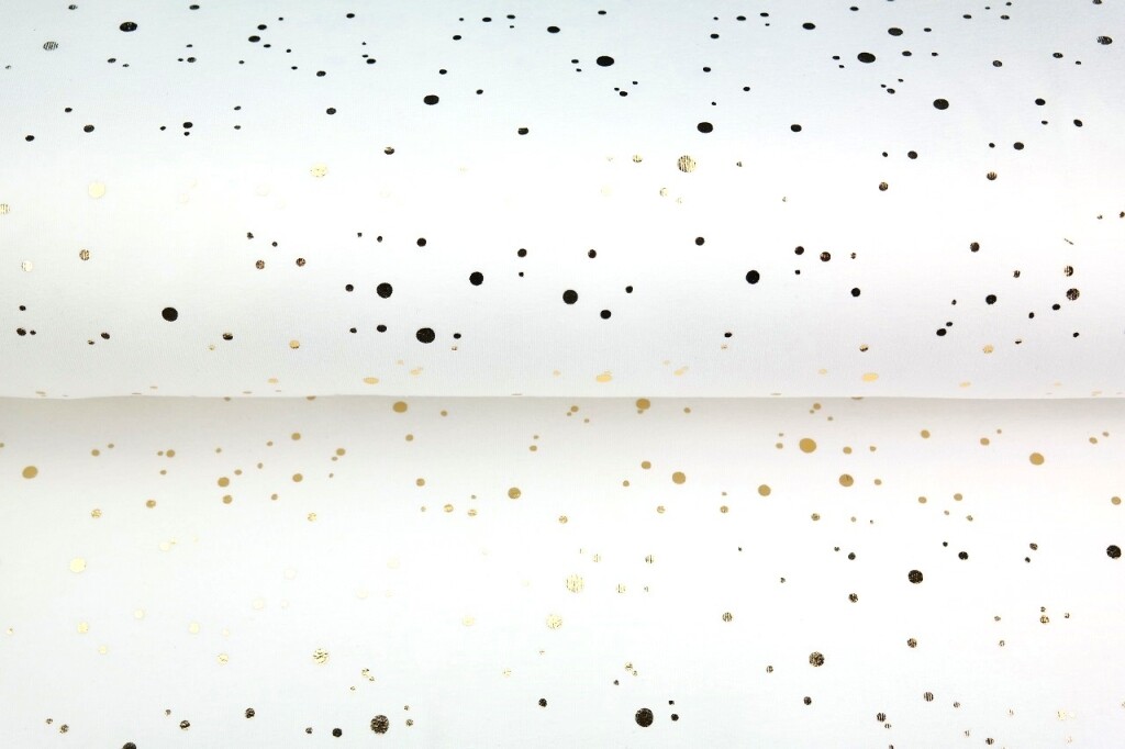 Foliopainatuksella trikoo on pehmeää ja joustavaa kangasta, koristeltu huomattavilla kultaisilla pisteillä. Se sopii erinomaisesti puseroihin, mekkoihin, leggingseihin ja asusteisiin, lisäten vaatteisiin juhlallisuutta ja eloisuutta.