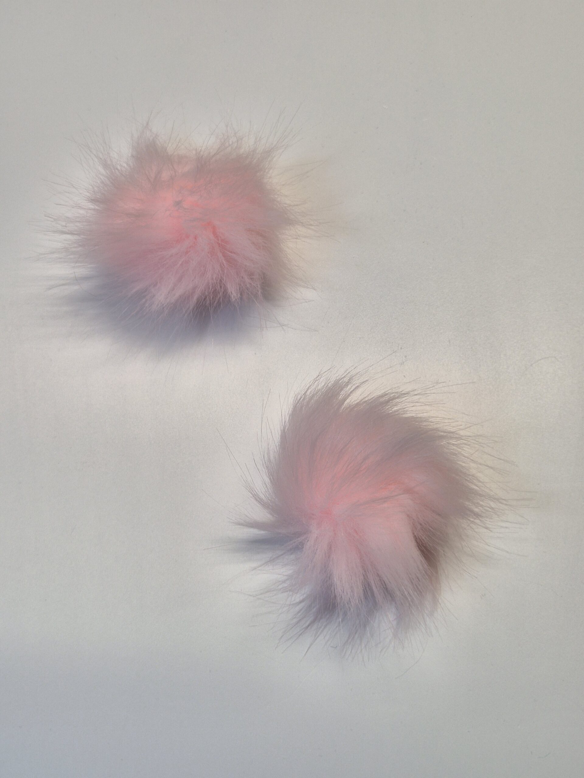 Kaks roosat karvast pom-pomi valgel taustal